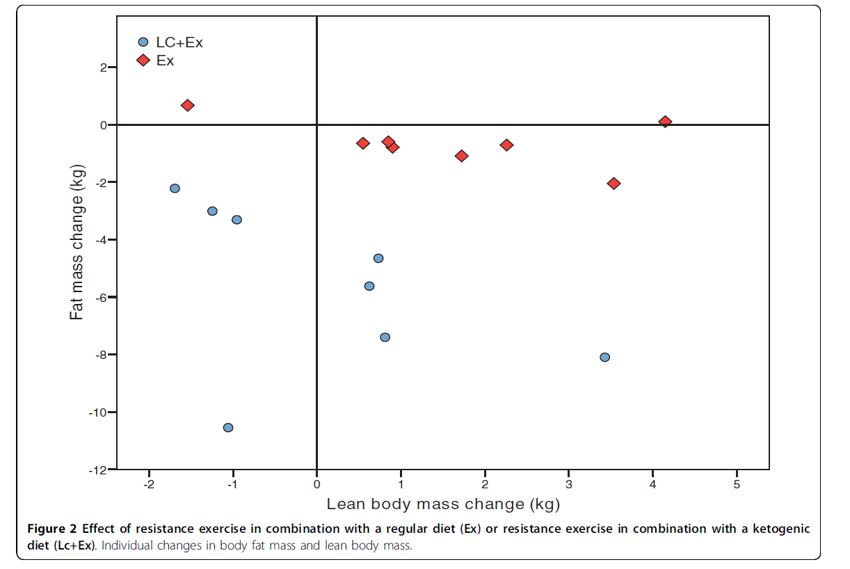 A few years ago I did a small study where we combined a ketogenic diet with resistance exercise [1]. After 10 weeks the 8 women in the diet group experienced a mean weight loss of 5,6kg. DEXA-scanning (Dual Energy X-ray Absorptiometry) showed that the mean fat mass loss was 5,6kg and that the fat free mass was unchanged. But, it would be wrong of me to say that this strategy conserves lean body mass, because the truth of the matter is that it all depends. Because 4 of the women in the diet group increased lean body mass, while 4 lost some despite the 10 weeks of resistance exercise. The individual results from the study are illustrated below.