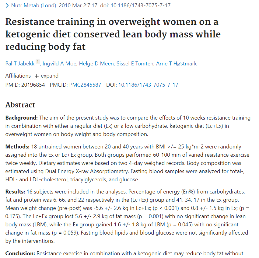 - Nutrition and Metabolism 2010 Mar 2;7:17. Resistance training in overweight women on a ketogenic diet conserved lean body mass while reducing body fat.